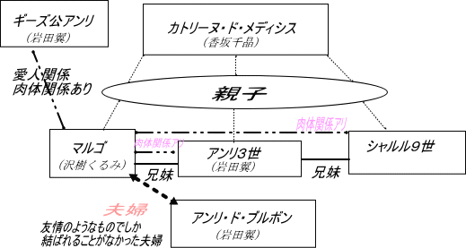 マルゴの夫、ナヴァル公アンリと朋友となり、母后にもマルゴにも内緒にしていた家庭をみせるまでになっています。